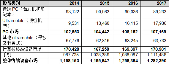 計(jì)算類終端設(shè)備市場(chǎng)今年預(yù)期將減少1.9%,主要受平板需求疲軟所影響。由于頂級(jí)ultramobile類終端設(shè)備將彌補(bǔ)傳統(tǒng)臺(tái)式機(jī)和筆記本電腦銷量的下滑,整體PC市場(chǎng)仍將持續(xù)小幅的增長(zhǎng)。
