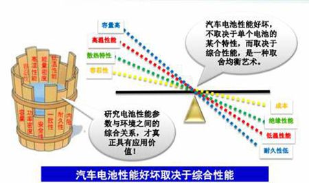 此外,動力電池的各項(xiàng)性能是相互平衡的,或者說“牽制”的,電池性能的優(yōu)劣不取決于單個電池的某項(xiàng)特性,而取決于綜合性能。從上圖中我們可以看出,容量與耐久性、高溫性能與低溫性能、散熱性與絕緣性、容忍性與成本是四組互相“矛盾”的參數(shù)。因此,匡德志強(qiáng)調(diào),只有綜合考慮電池性能參數(shù)與環(huán)境之間的關(guān)系,才能真正具有應(yīng)用價值。