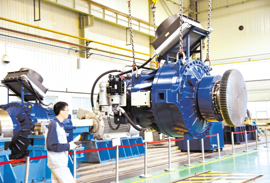 4月1日,裝配工人正在為一臺下線后經(jīng)過清洗的風電齒輪箱進行加載作業(yè)。據(jù)了解,包頭裝備制造產(chǎn)業(yè)園區(qū)國電聯(lián)合動力技術(shù)(包頭)有限公司引進德國技術(shù)專業(yè)生產(chǎn)1.5MW和2.0MW風力發(fā)電機組齒輪箱,項目一期工程總投資4.9億元,二期三期陸續(xù)新增投資3.4億元,現(xiàn)已具備年產(chǎn)800臺綜合齒輪箱能力。