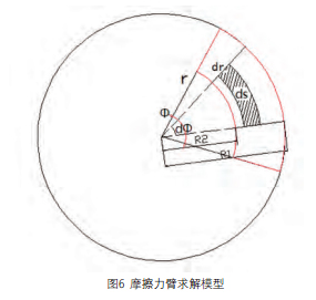 同理可以得到 My 的等效壓力以及上滑動(dòng)襯墊受到的傾覆力矩作用產(chǎn)生的壓力。將偏航模型簡(jiǎn)化為一個(gè)在水平面上定軸轉(zhuǎn)動(dòng)的圓臺(tái),則每個(gè)摩擦片可簡(jiǎn)化為如圖 6 的扇形塊,R1 和 R2 分別為摩擦片的外徑和內(nèi)徑,Φ 為張角,在摩擦片上取一微段 dΦ,長(zhǎng)度為 dr,則摩擦力矩 :