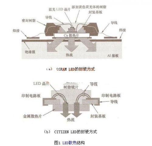 松下電器將公司多只白光LED制成在金屬材料與金屬系復(fù)合材料所制成的多層基板模塊上以形成光源模塊,利用光源基板的高導(dǎo)熱效果,使光源的輸出在長時(shí)間使用時(shí)仍能維持穩(wěn)定。Lumileds生產(chǎn)的白光LED基板所使用的材料為具有高傳導(dǎo)系數(shù)的銅材,再將其連接至特制的金屬電路板,就可以兼顧電路導(dǎo)通及增加熱傳導(dǎo)效果。