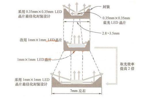 傳統(tǒng)的白光LED都是將邊長為200~350μm的正方形芯片封裝成圓頭柱外形,之后為了獲得照明所需要的光束,再將已封裝的多個(gè)白光LED組件排列成矩陣狀。單純以高輸出功率為目的而特別開發(fā)出的面積比以往芯片大6~10倍,外形尺寸高達(dá)500μm~1mm的白光LED,雖然封裝后可獲得數(shù)百毫瓦(數(shù)十流明)的輸出功率,但是加大芯片的外形尺寸,反而使白光LED內(nèi)部的光吸收比率增加、外部取光率降低。就以AlGaInPLED為例,芯片的外形尺寸從0.22mm×0.22mm加大為0.50mm×0.50mm后,外部取光率反而降低20%左右。
