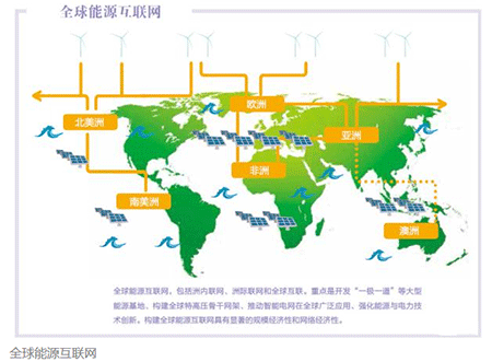根據(jù)國家電網(wǎng)董事長劉振亞所著的《全球能源互聯(lián)網(wǎng)》一書的構(gòu)想,全球能源互聯(lián)網(wǎng)將由跨國跨洲骨干網(wǎng)架和涵蓋各國各電壓等級(jí)電網(wǎng)(輸電網(wǎng)、配電網(wǎng))的國家泛在智能電網(wǎng)構(gòu)成。亞洲各大可再生能源基地——蒙古國風(fēng)電和太陽能發(fā)電基地、俄羅斯遠(yuǎn)東和西伯利亞水電基地、中亞風(fēng)電和太陽能發(fā)電基地、中國“三北”風(fēng)電和西北太陽能發(fā)電基地、白令海峽及庫頁島風(fēng)電基地、印度太陽能與風(fēng)電基地等,都將成為亞洲互聯(lián)電網(wǎng)內(nèi)的電源送出點(diǎn)。
