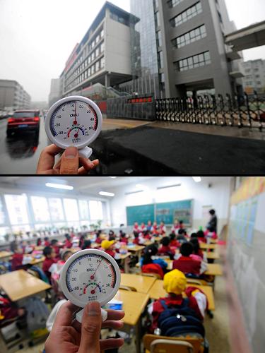 11月1日,太原市青年路小學(xué)室外測得溫度為14攝氏度(上圖),教室里測得溫度為22攝氏度(下圖)。當(dāng)日,太原市開始集中供熱,記者拿著溫度計走訪了多處住宅區(qū)、學(xué)校,體驗供熱效果。新華社記者 范敏達 攝
