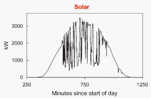 新能源:大部分綠色能源如風(fēng)能、潮汐能、太陽(yáng)能等等都有劇烈變化的特點(diǎn)。不僅一天之內(nèi)各個(gè)時(shí)間段差別巨大,而且前一分鐘和后一分鐘也差別巨大。由于這種變化太過頻繁(如下圖),用一般的充電電池做儲(chǔ)能設(shè)備幾天就報(bào)廢了,而超級(jí)電容則可以通過暫時(shí)存儲(chǔ)幾分鐘的能量,讓整個(gè)曲線變得非常平滑。