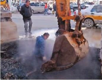 據(jù)附近的環(huán)衛(wèi)工人說,路面向外冒水是10月30日晚上的事,當(dāng)時并不嚴(yán)重,只是向外滲水。昨日7時許,供熱部門搶修人員、車輛就趕到了現(xiàn)場,對該處損壞管線進行維修。