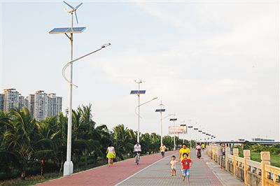 5月13日,市民在??跒I江路新型節(jié)能路燈下散步、騎行。