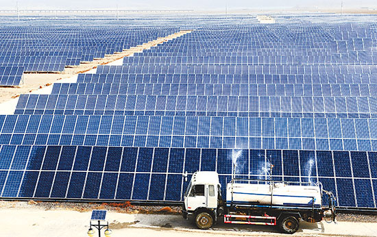 華電嘉峪關(guān)新能源有限公司員工正在沖洗光伏太陽(yáng)能發(fā)電板
