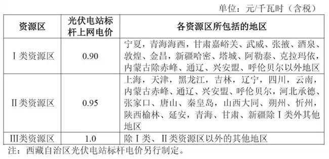 圖1:全國光伏電站標(biāo)桿上網(wǎng)電價(jià)表
