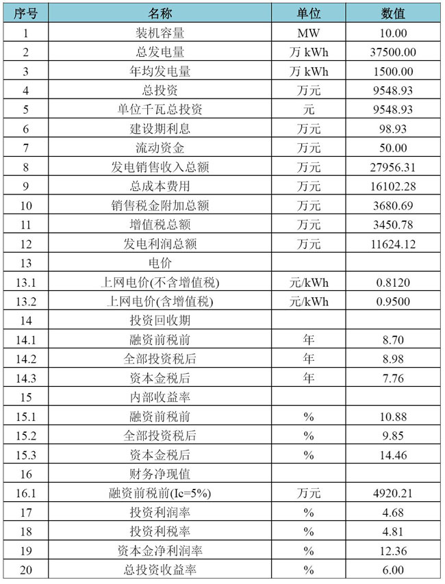 測(cè)算條件:?jiǎn)挝磺咴靸r(jià)為9400元,裝機(jī)容量為10MW,年滿發(fā)小時(shí)數(shù)為1500h,電價(jià)為0.95元/kWh