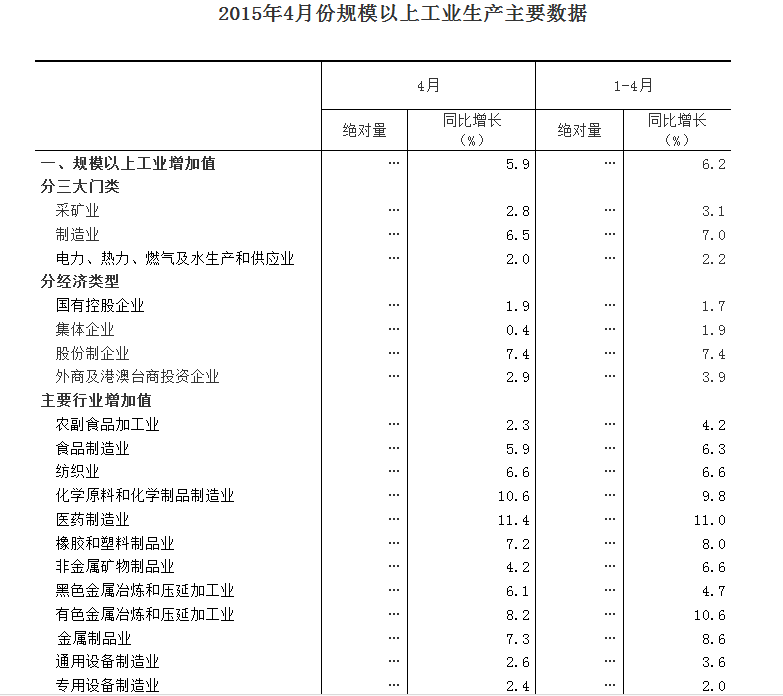 2015年4月份,規(guī)模以上工業(yè)增加值同比實(shí)際增長(zhǎng)5.9 %(以下增加值增速均為扣除價(jià)格因素的實(shí)際增長(zhǎng)率),比3月份加快0.3個(gè)百分點(diǎn)。從環(huán)比看,4月份,規(guī)模以上工業(yè)增加值比上月增長(zhǎng)0.57%。1-4月份,規(guī)模以上工業(yè)增加值同比增長(zhǎng)6.2%。