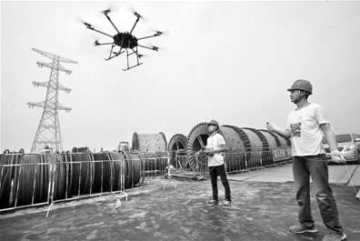 5月14日,施工人員使用無人機進行牽引繩引渡放線。當日,在位于江蘇昆山境內(nèi)的淮南-南京-上海特高壓1000千伏交流輸變電工程施工現(xiàn)場,施工人員使用八旋翼無人機“穿針引線”,在兩座高逾144米、重達570噸的特高壓鐵塔之間架設線路,大大縮短了施工時間,節(jié)約了施工成本。
