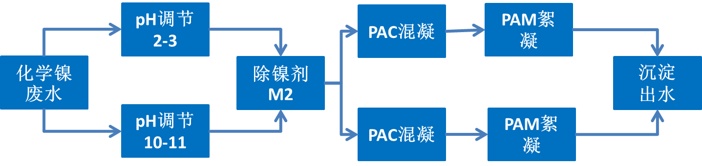 在電鍍廢水中,如果只是電鍍鎳,而非化學(xué)鍍,那么在廢水中,鎳是以離子態(tài)的形式存在,針對離子態(tài)的鎳,只需要用片堿進行調(diào)節(jié)pH,再通過PAC混凝,PAM絮凝沉淀,即可把電鍍鎳沉淀除去。但是在有的電鍍廢水中,因為前面分流不得當(dāng),或者在電鍍鎳廢水中摻雜了前處理水,導(dǎo)致廢水中會存在絡(luò)合劑,那么如果只是加堿調(diào)節(jié),鎳離子是無法沉淀的。這時需要加入重捕劑M1進行螯合沉淀處理,通過與鎳離子生成不溶性螯合物而把鎳離子濃度降低,達到污水處理排放標準。