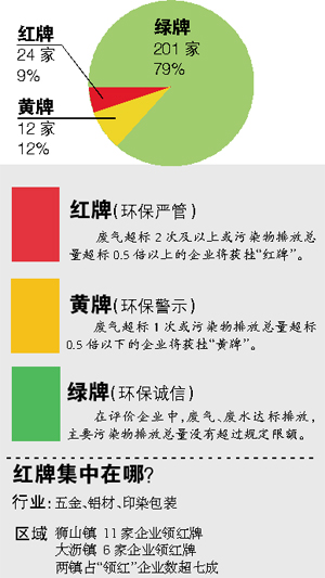 哪類(lèi)企業(yè)被賜紅牌最多?根據(jù)評(píng)價(jià)結(jié)果顯示,多年以來(lái)領(lǐng)紅牌的企業(yè)主要集中在五金、鋁材、印染包裝行業(yè),24家紅牌企業(yè)中有15家。“一方面這和南海的產(chǎn)業(yè)構(gòu)成相關(guān),另一方面也是這類(lèi)企業(yè)有較多的排水排氣,環(huán)保違規(guī)的機(jī)會(huì)多。”南海區(qū)環(huán)保部門(mén)相關(guān)負(fù)責(zé)人指出。同時(shí),在鎮(zhèn)街分布來(lái)看,獅山鎮(zhèn)、大瀝鎮(zhèn)各有11家、6家企業(yè)領(lǐng)得紅牌,兩鎮(zhèn)占“領(lǐng)紅”企業(yè)數(shù)超七成。