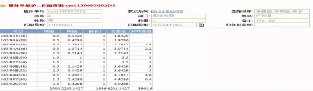 另外,還要建匹配查詢。在系統(tǒng)自動匹配出號型和款型,同時設(shè)計了匹配查詢功能,可以針對每一個被測體的數(shù)據(jù),顯示其關(guān)鍵測體尺寸與生產(chǎn)款型的對應部位尺寸差值之和(差值越小,則匹配度越高),包括總差值和跨檔差值(超出部位檔差的差值),在總差值相等的前提下,以跨檔差值較小的優(yōu)先排序。這一功能可查詢到系統(tǒng)自動匹配的過程和差異,及與手工匹配的結(jié)果進行對比,如果出現(xiàn)較大的區(qū)別,則可能需要對匹配的參數(shù)進行相應調(diào)整。如圖2所示。