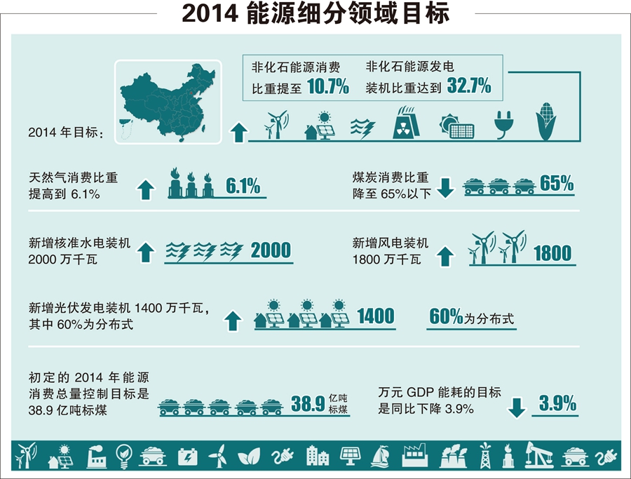 “2014 年,能源消費(fèi)總量控制目標(biāo)是38.9 億噸標(biāo)煤,萬(wàn)元GDP 能耗目標(biāo)是同比下降3 .9%。”國(guó)家發(fā)改委副主任、國(guó)家能源局局長(zhǎng)吳新雄在2014年1月13日全國(guó)能源工作會(huì)議上表示,“非化石能源消費(fèi)比重提至10.7%,非化石能源發(fā)電 裝機(jī)比重達(dá)到32.7%,天然氣消費(fèi)比重提高到6.1%,煤炭消費(fèi)比重降至65%以下。”