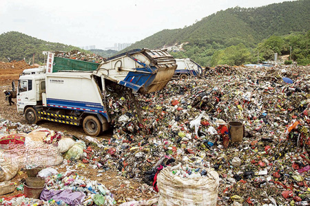 圖為5月30日,一輛運輸車將垃圾傾倒在垃圾填埋場。