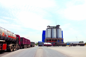 磷石膏的處理一直困擾著磷化工企業(yè)。紅日阿康用磷石膏生產(chǎn)的建筑石膏粉得到市場認可。圖為廠區(qū)運貨的車輛絡(luò)繹不絕。 (李從容 攝)
