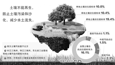 首次全國土壤污染狀況調(diào)查(2005年4月~2013年12月)結果顯示,全國土壤總的點位超標率為16.1%,其中輕微、輕度、中度和重度污染點位比例分別為11.2%、2.3%、1.5%和1.1%。耕地土壤點位超標率為19.4%,其中輕微、輕度、中度和重度污染點位比例分別為13.7%、2.8%、1.8%和1.1%。林地、草地和未利用地土壤點位超標率分別為10.0%、10.4%和11.4%。