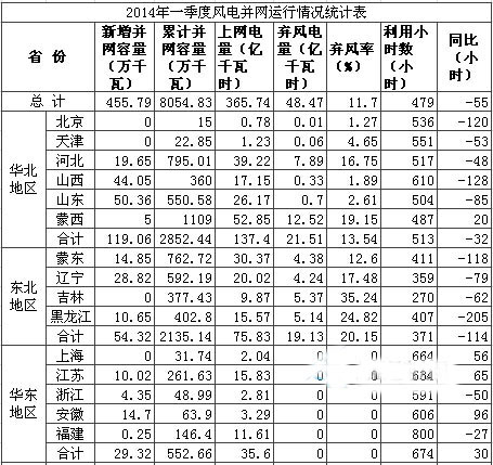 附:2014年一季度風(fēng)電并網(wǎng)運(yùn)行情況統(tǒng)計(jì)表: