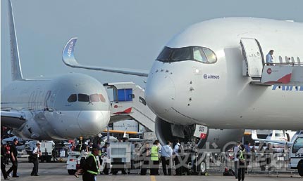 2月在新加坡舉辦的亞洲最大航展。波音787(后)與空客A350XWB(前)成為了關(guān)注的焦點(diǎn) 攝影:Landov/Aflo