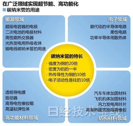 CNT是名城大學教授飯島澄男于1991年在全世界首先發(fā)現(xiàn)的。雖然CNT與其他材料相比特性超群,但應用于產(chǎn)業(yè)的技術難度高,一直沒有突破“夢幻新材料”的領域走向?qū)嵱?。不過,時至今日,隨著實用化相關技術的大幅進步,CNT正在逐漸改變我們的生活。