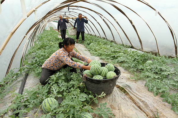 6月21日,房縣紅塔鎮(zhèn)塘溪村農(nóng)家婦女鄭旭蓮(前)正在節(jié)水滴灌大棚釆收西瓜。2014年10月,鄭旭蓮在縣水利技術(shù)人員的指導(dǎo)下,建起40畝大棚節(jié)水滴灌水利設(shè)施,引種新疆優(yōu)質(zhì)高產(chǎn)麒麟西瓜,實(shí)現(xiàn)致富夢(mèng)想。目前,鄭旭蓮的滴灌大棚西瓜已經(jīng)進(jìn)入上市高峰,平均每天銷售西瓜2800公斤,預(yù)計(jì)今年實(shí)現(xiàn)收入達(dá)60多萬(wàn)元。