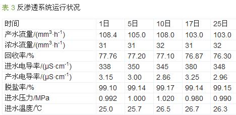 反 滲透技術(shù)在該廠大型水處理項目中的設(shè)計是可行的,經(jīng)過實際應(yīng)用的情況來看,運(yùn)行效果較好,適用于該廠大規(guī)模電子超純水的處理。時代沃頓的PURO-I膜在 此系統(tǒng)中的運(yùn)行較好,給該廠后續(xù)的水處理工藝提供了穩(wěn)定的水質(zhì)。一級反滲透系統(tǒng)在運(yùn)行期間系統(tǒng)的運(yùn)行壓力在1MPa左右;系統(tǒng)的進(jìn)水電導(dǎo)率在 300~400μS/cm之間波動,產(chǎn)水電導(dǎo)率始終在5μS/cm以下,系統(tǒng)的脫鹽率在98.5%以上;系統(tǒng)的平均產(chǎn)水量在100mm3/h左右,系統(tǒng)的 回收率在75%左右,滿足客戶的供水要求。反滲透系統(tǒng)運(yùn)行期間對運(yùn)行情況進(jìn)行了記錄分析,以單套系統(tǒng)為例數(shù)據(jù)詳情如表3所示。