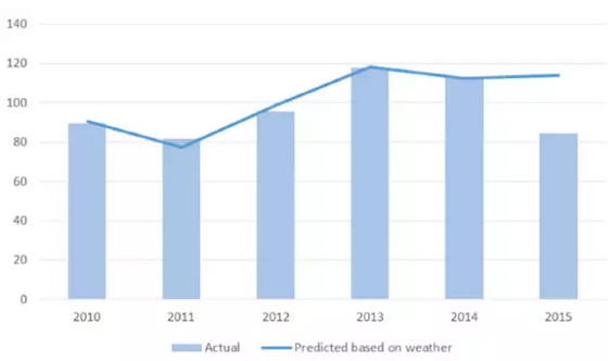 通過(guò)回顧分析,我們發(fā)現(xiàn),在2010年、2012年、2013年和2014年,北京的氣象因素和空氣質(zhì)量之間,是有強(qiáng)相關(guān)的。但是在2015年北京的實(shí)際PM2.5濃度,與基于氣象因素的空氣預(yù)測(cè)值相比明顯偏低,也就是說(shuō)今年的空氣質(zhì)量和氣象因素的關(guān)聯(lián)性沒(méi)有以往那么高。