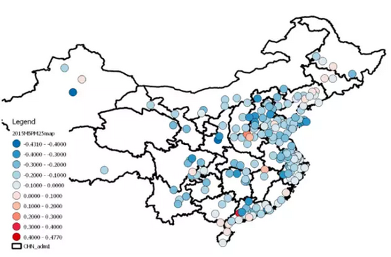 Lauri Myllyvirta:我們將中國(guó)政府發(fā)布的2015年和2014年數(shù)據(jù)做了對(duì)比,發(fā)現(xiàn)總體上來(lái)說(shuō)全國(guó)各地的空氣質(zhì)量都有所改善,但是有一個(gè)問(wèn)題就是改善的分布不均(如下圖)。