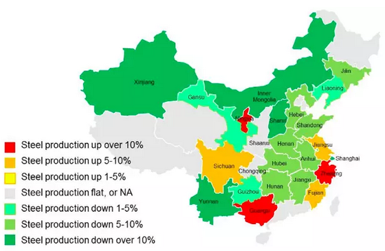 與此同時(shí),多數(shù)省份的重工業(yè)部門(mén)已經(jīng)開(kāi)始減少產(chǎn)量。鋼鐵產(chǎn)量(經(jīng)常被認(rèn)為是空氣污染的罪魁禍?zhǔn)字?在2015年前四個(gè)月與2014年同期相比已普遍持平或下降。