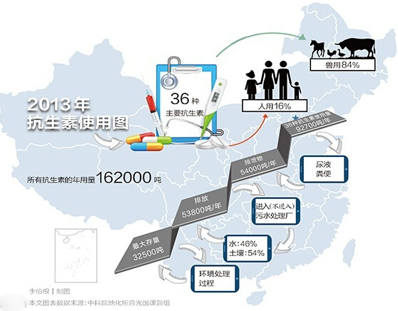 中國(guó)第一份抗生素使用量和排放量清單公布。2013年,我國(guó)抗生素使用總量約16.2萬(wàn)噸,其中獸用抗生素占一半以上。
