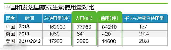 中國(guó)和發(fā)達(dá)國(guó)家抗生素使用量對(duì)比。 (李伯根/圖)