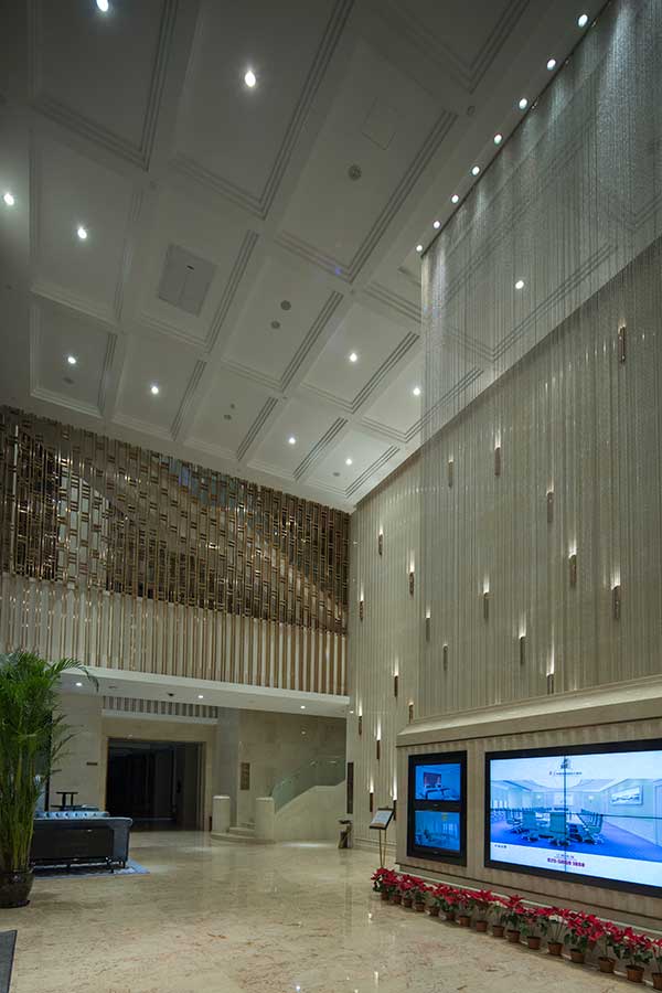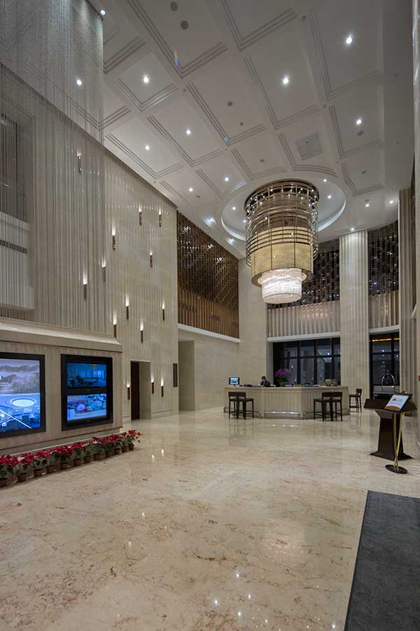 酒店大堂照明既要明亮,又要展現(xiàn)出酒店的人文氣息,從酒店大堂建筑布局即可窺見其融合地域文化和時代潮流的氣息。正對門口的墻上,錯落的豎行裝飾在燈光的烘托下,如奧運火炬般給人驚喜之感,能讓人感受到酒店追求更好的強烈理念。酒店巧借國際通用的運動圖騰,寓涵追求卓越的品質。而這一部分,對于燈光的光斑有著極高要求。