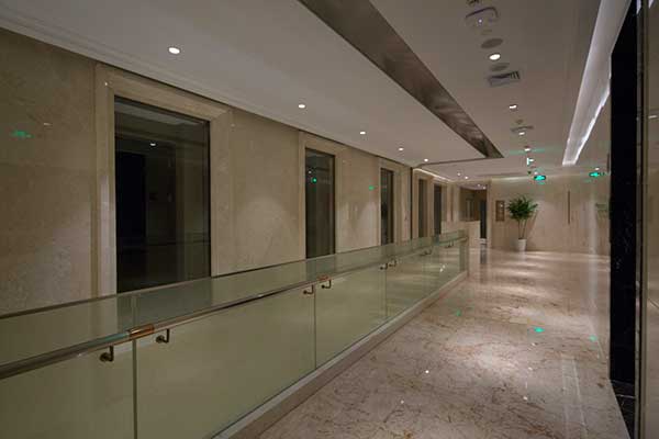 酒店的大堂根據(jù)其深度不足、寬度足夠的情況,科學布局,營造空闊視覺效果。采用鏤空裝飾手法,豐富層次,制造驚喜。結合燈光的巧妙應用,避免大堂照明明暗差別過大,還能減少顧客等待過程中產(chǎn)生的煩躁與不滿。