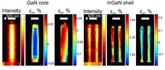 每個(gè)納米線(xiàn)的X射線(xiàn)影像顯示散射強(qiáng)度的分布,以及在氮化鎵核心與氮化鎵銦外層的機(jī)械應(yīng)變。根據(jù)這種應(yīng)變顯示外層與核心完美契合。