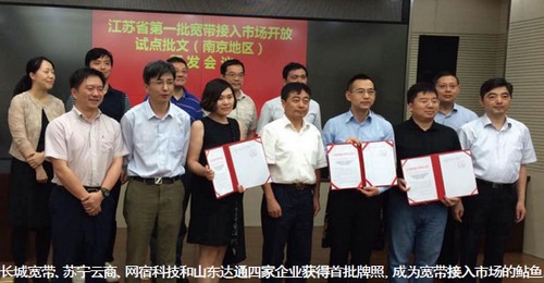 根據(jù)政策,審批主體為試點城市通信管理局。6月23日,江蘇省通信管理局向長城寬帶、蘇寧云商、網(wǎng)宿科技三家企業(yè)頒發(fā)全國第一批南京地區(qū)寬帶接入網(wǎng)絡民營試點企業(yè)試點批文,山東達通則獲得了山東通管局的試點批文。