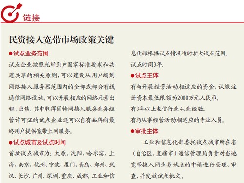 對于基礎運營商而言,民資進入有利于幫助其拓展市場,提高寬帶市場的普及率。業(yè)內(nèi)人士表示,由于接入難、寬帶建設資金不足等諸多問題,成為了阻礙我國寬帶業(yè)務深度普及的“最后一公里”。民資進入寬帶接入市場后,能夠深入到小的地方和比較偏僻地區(qū),從而進一步提高寬帶市場的普及率。