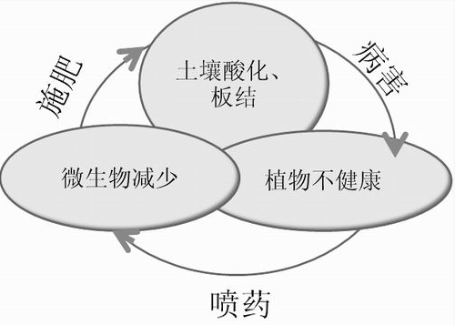 土壤是上述的惡性循環(huán)的直接受害者,高量超量化肥帶來了土壤內(nèi)部的酸化和板結、大量農(nóng)藥傷害了土壤中固有的龐大的食物網(wǎng),導致土壤生態(tài)系統(tǒng)物質(zhì)流、能量流和信息流的不暢或者斷裂,直接表現(xiàn)在養(yǎng)分循環(huán)和供給能力的降低,也破壞了有益生物和有害生物相互間的相生相克能力。