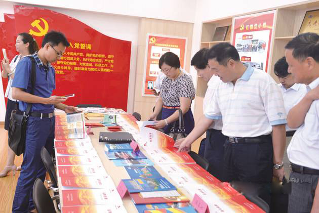 6月30日,湖北省交通運(yùn)輸廳在紅安縣召開紀(jì)念中國共產(chǎn)黨成立94周年表彰大會暨創(chuàng)建紅旗黨支部現(xiàn)場會,對廳直屬機(jī)關(guān)紅旗黨支部、優(yōu)秀共產(chǎn)黨員、優(yōu)秀黨務(wù)工作者進(jìn)行了表彰。圖為黨員代表觀摩黃黃高速公路管理處紅安支部黨建活動陣地。