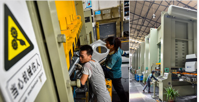 左圖:佛山盈特集團(tuán)有限公司傳統(tǒng)沖壓車間工人在高溫下作業(yè)。每臺這種傳統(tǒng)沖床需要4名工人操作。