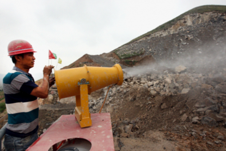 搖著“水炮”,正向不同方向除塵的一位工人師傅介紹說,這種裝置采石場(chǎng)購置了十幾臺(tái),分散在場(chǎng)區(qū)各個(gè)角落,“其實(shí)采用全封閉生產(chǎn)線以后粉塵已經(jīng)很少了,但老板說既然整改就一步到位,盡可能把所有粉塵的逸出都控制住。