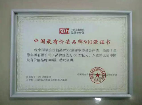 2015年6月28日,第九屆中國(guó)最有價(jià)值品牌500強(qiáng)評(píng)選活動(dòng)在廣州舉行,經(jīng)評(píng)選活動(dòng)專家委員會(huì)評(píng)估,桑德集團(tuán)入選第九屆中國(guó)最有價(jià)值品牌500強(qiáng),品牌價(jià)值133.22億元,持續(xù)領(lǐng)銜環(huán)保行業(yè)。