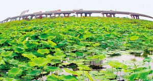 水質(zhì)改善后的渭河橋下,綠色的荷葉鋪滿水面