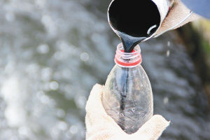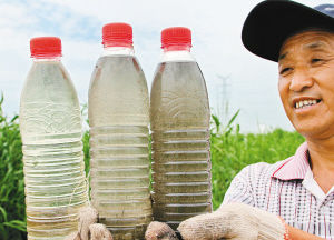 2015年7月2日的中午,氣候有些悶熱,工人王鋒和詹成平正用柴油打草機除草。每塊水田旁都有田埂道路,除草是為了讓道路暢通。在田埂道路下埋有粗粗的管道。取水工文顯金在各個渠道口采取水樣,經(jīng)過三級凈化,來自河的污水變得清澈起來,拿著流入渭河口取出的水樣,他說:“游泳都沒有問題。”
