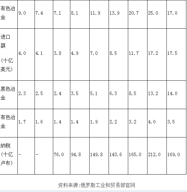 俄羅斯冶金工業(yè)包括黑色、有色金屬礦產(chǎn)和非金屬礦產(chǎn)的開采;生鐵、鋼、軋材、鋼管、鐵合金、耐火材料、焦炭、鋁、銅、稀有金屬(鎳、鈷、鉛、鋅、錫等)的生產(chǎn);有色金屬(鈦、鎂、有色重金屬)、硬質(zhì)合金產(chǎn)品的生產(chǎn)和半導(dǎo)體的加工;廢鐵、廢金屬的深加工和某些相關(guān)化學(xué)產(chǎn)品的生產(chǎn)。此外,冶金行業(yè)中含有大量輔助性質(zhì)企業(yè)、科研和設(shè)計(jì)組織。