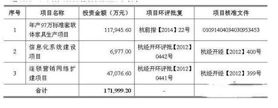 根據(jù)顧家家居股份有限公司招股書,本次擬公開發(fā)行不超過(guò)11,000萬(wàn)股普通股股票,公司股東公開發(fā)售股份數(shù)量不超過(guò)8,325萬(wàn)股,擬募集資金約17.2億,將投資于“年產(chǎn)97萬(wàn)標(biāo)準(zhǔn)套軟體家具生產(chǎn)項(xiàng)目”、“信息化系統(tǒng)建設(shè)項(xiàng)目”和“連鎖營(yíng)銷網(wǎng)絡(luò)擴(kuò)建項(xiàng)目”。