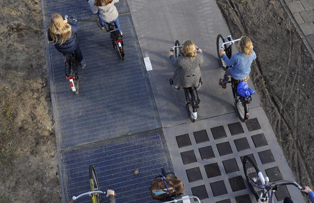 這條道路是自行車道,總長(zhǎng)度約為70米。它在水泥板里嵌入了晶體硅太陽(yáng)能電池板,可將太陽(yáng)能轉(zhuǎn)化成電,并輸送給電網(wǎng),為街燈、交通信號(hào)燈或附近民宅供電。而路面表層是可起到保護(hù)作用的玻璃,可承受12噸重消防車的重量。