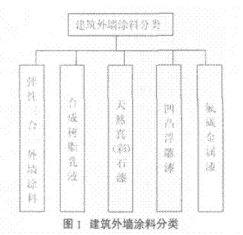 我國的建筑外墻涂料主要可以分為以下五種(如圖1):彈性三合一外墻涂料、合成樹脂乳液、天然真(彩)石漆、凹凸浮雕漆、氟碳金屬漆。以上物種材料除合成樹脂乳液為薄質(zhì)涂料外,其余均為厚質(zhì)涂料,其中應(yīng)用最廣泛的外墻涂料合成樹脂乳液。建筑外墻涂料對建筑物有著保護(hù)和裝飾的作用,環(huán)保型建筑外墻涂料與傳統(tǒng)的建筑外墻涂料相比,色彩更豐富、更節(jié)能環(huán)保也更易更新,因而環(huán)保建筑外墻涂料在我國建筑業(yè)的使用形成了一種必然的趨勢。