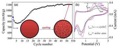 (a) γ-Fe2O3@C/MWNT電極的循環(huán)性能及微結(jié)構(gòu)演化示意圖;(b) γ-Fe2O3@C/MWNT電極在不同循環(huán)次數(shù)后的CV曲線。